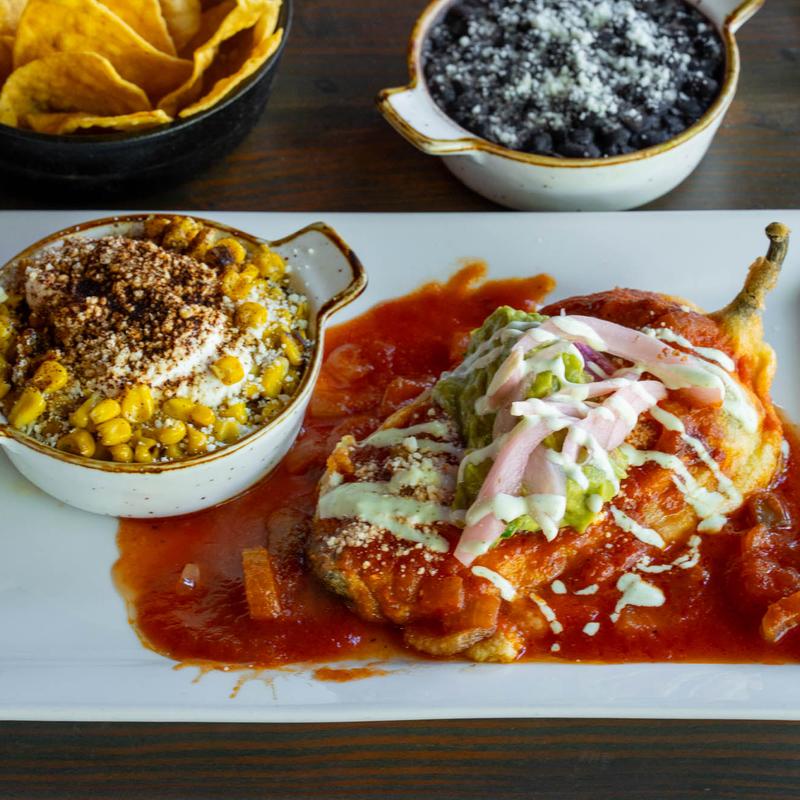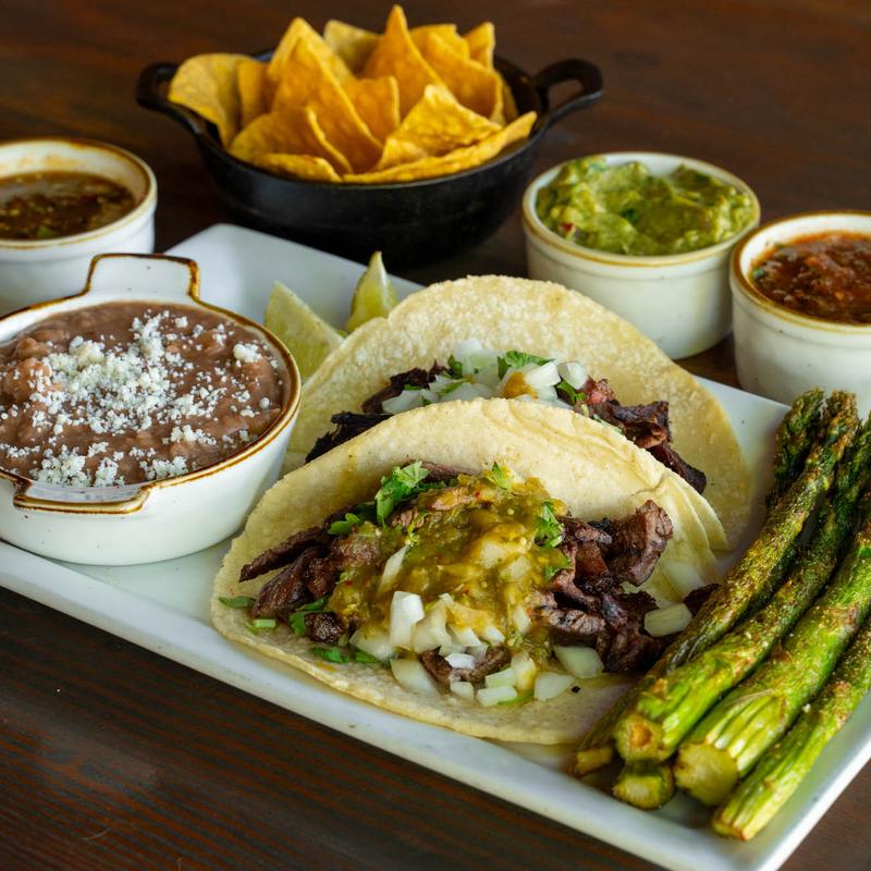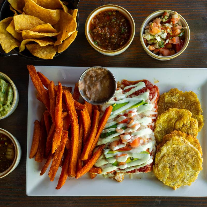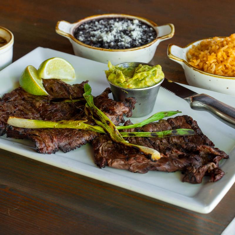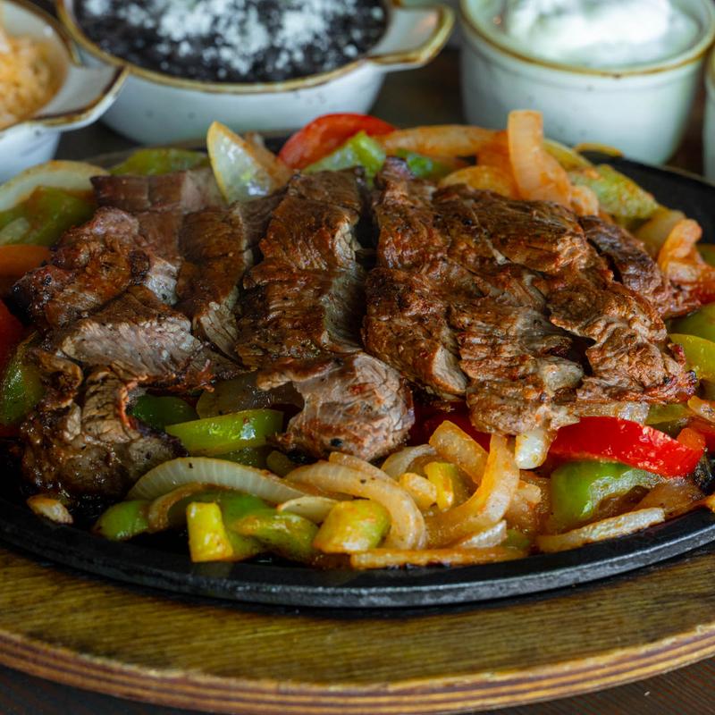 Grilled peppers and onions, Jack cheese, Mexican crème, guacamole, and warm tortillas, served with black beans and Spanish rice.